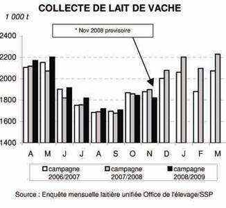 Avec 1789 millions de litres collectés en octobre 2008, la production laitière française est donc en recul de 0,8% par rapport à la collecte enregistrée en octobre 2007. En outre, la tendance se serait maintenue en novembre puisque les prévisions établies font état d’une chute de 4% en novembre, allant même jusqu’à baisser de 5% sur la 1ère semaine de décembre 2008 (vs. 1ère semaine décembre 2007), d’après les derniers sondages hebdomadaires réalisés par l’Office de l’élevage.