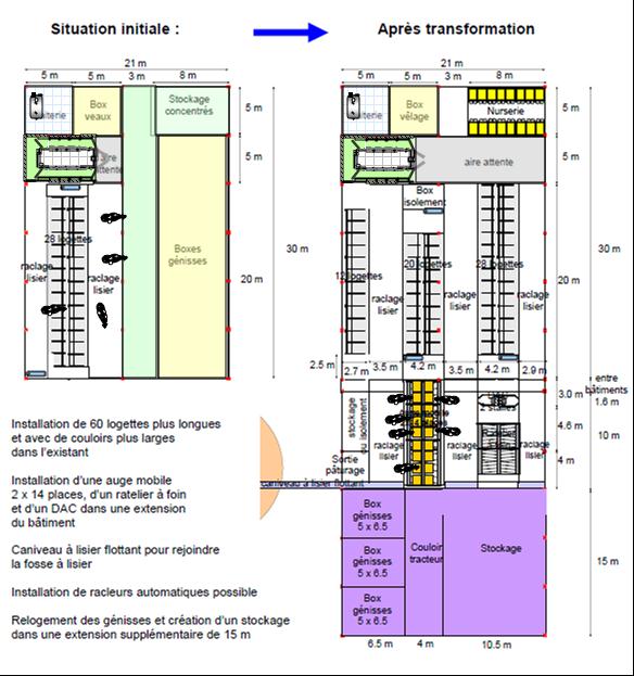 Un bâtiment neuf complet, avec traite et stockage des déjections, c’est aujourd’hui entre 7 et plus de 10.000 euros par vache, variable suivant les choix d’équipement, la part d’auto construction, le terrassement, les économies d’échelle, la zone géographique… C’est pourquoi, la modification ou l’extension d’un bâtiment existant est en principe beaucoup moins coûteux, mais souvent plus difficile à concevoir. De nombreux producteurs de lait sont animés par ces réflexions visant à gagner du temps ou à augmenter le nombre de places en bâtiments sans se lancer dans de grands travaux.