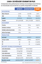 Les fermes en monotraite produisent un lait plus riche, donc mieux valorisé, ce qui ne compense que partiellement les moindres livraisons de lait par UTH. En revanche, le produit de la vente de la viande est plus élevé de 11 %. Le produit total reste malgré tout plus faible en monotraite mais le résultat courant par associé est plus élevé.