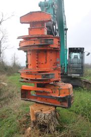 Comme son nom l’indique, la tête d’abattage équipée d’un sécateur tranche le bois par l’effet de la pression hydraulique exercée entre deux mâchoires placées à la base de la pince. C’est un système simple et efficace, nécessitant peu d’entretien. En revanche, le sécateur est limité à des coupes de l’ordre de 30 à 40 cm de diamètre et, avec cet outil, il arrive parfois que le bois éclate sous l’effet de la pression.