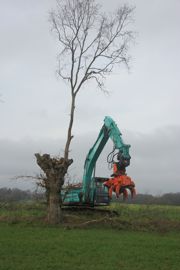 Pouvant s’orienter dans quasiment toutes les directions, les têtes d’abattage mécanisées sont également bien adaptées pour saisir une à une les branches en hauteur quand il s’agit d’une coupe en têtard. Cette pratique, très répandue dans les zones bocagères, consiste à conserver un tronc d’environ 3 ou 4 mètres de hauteur et à venir prélever uniquement les branches tous les quinze à vingt ans. Au printemps suivant la coupe, les bourgeons situés en tête du tronc donneront naissance à de nouvelles branches qui vont repousser sur tout le pourtour. Sur certaines espèces comme le chêne notamment, il faut laisser une branche tire-sève pour maintenir l’alimentation de l’arbre grâce à la photosynthèse. L’idéal est de choisir une branche située sur un côté facilement accessible pour que l’exploitant puisse venir la couper sans risque avec sa tronçonneuse, deux ou trois ans plus tard. Dans des haies de frênes, il n’est généralement pas nécessaire de laisser de tire-sève, car il s’agit d’une espèce très vigoureuse dont la repousse est presque toujours garantie. Après une intervention mécanisée sur des haies en têtard, l’agriculteur doit généralement repasser pour peaufiner le travail et recouper la base des branches au plus près du tronc. En effet, des éclats peuvent subsister et leur élimination accélère la cicatrisation du tronc. Cette intervention manuelle est aussi l’occasion de supprimer le lierre ou les petites branches que la machine n’a pas coupés. Bien qu’il faille travailler en hauteur, ce rattrapage est facile à sécuriser puisque les grosses branches ne sont plus là et qu’il ne reste que des petits morceaux de bois à couper.