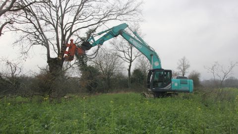« Nous avons réalisé l’entretien pendant trois hivers consécutifs, évitant ainsi de réaliser une coupe rase qui aurait été préjudiciable à la biodiversité, commente Maxime Quignon, technicien à la Scic. Cela a également permis d’échelonner les repousses et de conserver une haie avec plusieurs étages. Pour nous, la durabilité des chantiers est un aspect important et les gens avec qui nous travaillons le comprennent bien. C’est la société Moreau qui est intervenue sur le chantier. Elle fait partie des différents prestataires partenaires de la Scic au niveau du département. Cette entreprise possède plusieurs pelleteuses équipées d’une tête de coupe. Le chauffeur intervient ainsi en sécurité, avec un rendement bien supérieur à celui d’une équipe de bûcherons travaillant à la tronçonneuse, pour un résultat de qualité. »