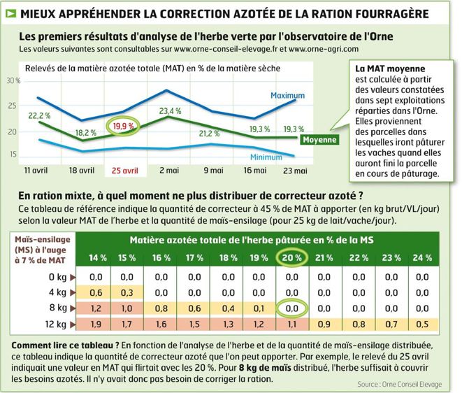 Force est de constater que ces informations ne sont pas suffisantes pour rassurer les éleveurs sur la qualité de ce que consomment leurs vaches. La pratique du pâturage bute sur l'absence de données concernant la valeur alimentaire de l'herbe à l'instant T. L'analyseur AgriNIR d'OCE y répond en partie. Depuis le 11 avril, il fournit la valeur en matière azotée totale des parcelles que les laitières pâtureront lorsqu'elles auront fini celles en cours. « Cela permet d'ajuster la correction azotée (ci-dessus). » En amont, il a fallu étalonner AgriNIR sur l'herbe verte. « L'an passé, l'Inra du Pin-aux-Haras nous a transmis les analyses biochimiques de 90 échantillons de différentes espèces et variétés, prélevés dans le cadre de ses travaux. De notre côté, nous avons spectré ces mêmes échantillons et avons transmis tous les résultats à un laboratoire pour calibrer AgriNIR. »