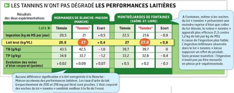 Pour Denis Chapuis, de la chambre d'agriculture de Saône-et-Loire et animateur du pôle laitier Bourguignon, l'adjonction de 80 g par vache et par jour de tannins de châtaignier dans une ration excédentaire en azote soluble semble permettre une meilleure valorisation de celle-ci, sans modifier la quantité et la qualité du lait produit. « Toutefois, l'essai mené à Fontaines ne permet pas de conclure. Il nécessite d'être reconduit dans une situation de pâture exclusive comprenant au minimum 30 % d'herbe dans la ration (des laitières de préférence en début de lactation). »