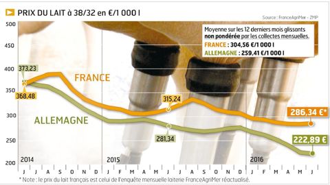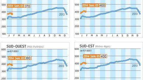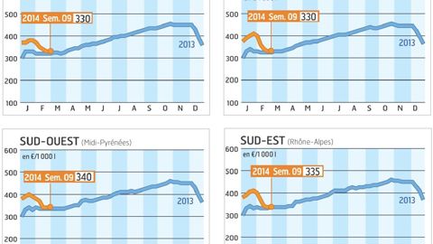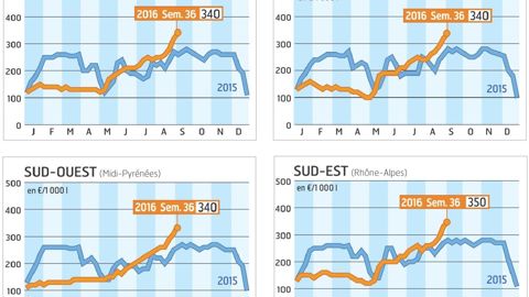 COMMENT INTERPRÉTER CES GRAPHIQUES ? La courbe verte correspond à un prix moyen du lait en France. En février, l'estimation d'Atla (Association des transformateurs de lait) l'établit à 380 €/1 000 l. La courbe jaune correspond à la valorisation en beurre et poudre d'un litre de lait collecté. Atla estime qu'elle est à 399 €/1 000 l. En février, la valorisation beurre-poudres était supérieure de 19 € au prix moyen du lait payé aux producteurs. Source :FranceAgriMer