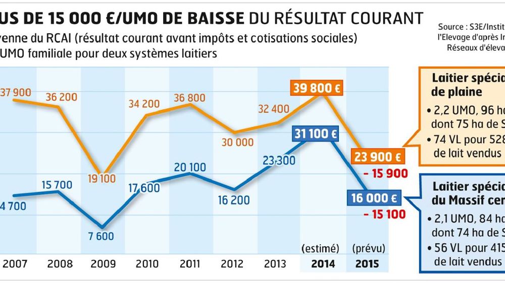 Entre la baisse du prix du lait, la canicule et la sécheresse estivale qui ont affecté la production laitière et fourragère dans certaines régions, sans oublier un prix des aliments toujours élevé, il fallait s'attendre à une chute des revenus des exploitations laitières en 2015. Elle est, sans surprise, spectaculaire, au diapason de la tension qui s'est exprimée tout l'été et continue de plomber le moral dans les campagnes. Les ingénieurs des réseaux d'élevage de l'Institut de l'élevage, qui ont fait un travail de prospective, évaluent son impact à une baisse du RCAI (résultat courant avant impôts et cotisations sociales) de plus de 15 000 € par UMO familiale (unité de main-d'oeuvre). Cette estimation vaut pour les deux groupes d'exploitations laitières étudiés, des systèmes spécialisés en plaine ou dans le Massif central.