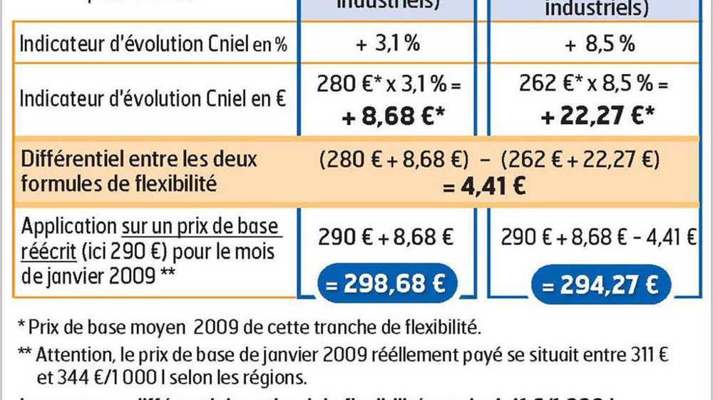 Concrètement, les prix de janvier et février seront de 298,68 € et 268,68 € pour la première région et de 296,68 € et 293,48 € pour la seconde, acomptes déduits (décision définitive le 5 janvier). Le grand-Est enregistre, lui, une hausse : 294,38 € en janvier et février 2010 contre 287,50 € en janvier et février 2009.
