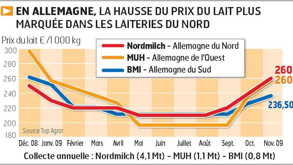 Les producteurs allemands commencent à retrouver le moral, avec un temps d'avance sur les Français. La réactivité immédiate de leur prix du lait aux évolutions du marché explique cela. Après être resté au ras des pâquerettes depuis le printemps 2009, le prix a frémi en septembre, puis augmenté franchement en octobre et novembre. Du moins pour les laiteries du nord, plus engagées sur les produits industriels. Témoin : Nordmilch, dont le prix, scotché entre 210 et 220 €/1 000 kg (lait à 37/34), a gagné deux fois 20 € pour atteindre 260 €. La hausse est beaucoup moins sensible au sud de la Bavière. Principal exportateur de lait UHT en France, la MUH (1,1 million de tonnes traitées sur un seul site), à l'ouest du pays, a aussi réduit son avantage compétitif avec les fabricants de l'Hexagone. De 200 €/1 000 kg de mai à septembre, son prix a gagné 40 et 20 € pour atteindre 260 €/1 000 kg. En novembre, seules trois laiteries allemandes arrivaient au seuil de 300 €/1 000 kg.