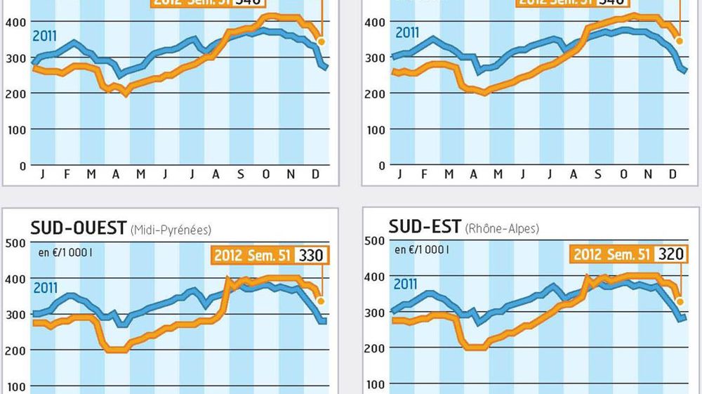 Rien d'anormal à ce que le prix du lait Spot chute la semaine précédant celle de Noël. Il est rare, en revanche, d'observer un marché aussi ferme jusqu'à la fin. Comparés à 2011, les cours sont en hausse de 40 à 60 €/1 000 l sur la semaine 50. Cela s'explique par une collecte toujours à la peine en France, face à une demande de l'industrie agroalimentaire, notamment des produits frais (yaourts, desserts…), bien soutenue. Cette bonne tenue du lait entier sur la fin de l'année vaut aussi pour les autres liquides (crème, lait écrémé) vendus sur le marché Spot.