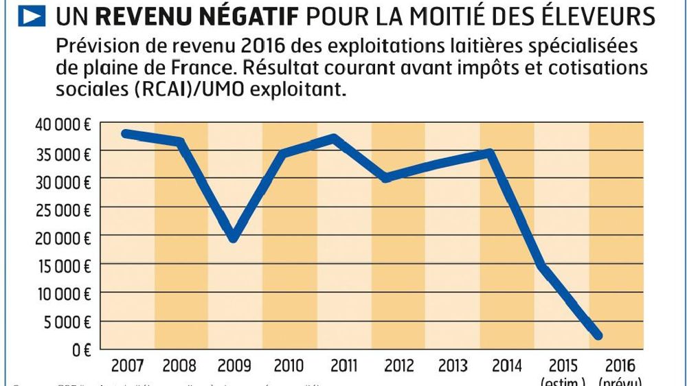 Autre méthode, mais des résultats comparables : l'Institut de l'élevage a publié une pré-estimation des revenus des exploitations laitières de plaine sur la base d'un panel de 250 élevages. Il table sur une baisse de prix du lait de 26 €/1 000 litres en 2016. Ces travaux concluent sur un revenu négatif pour la moitié des éleveurs avec une forte disparité. En moyenne, il chute de 12 000 €/UMO pour atteindre un niveau quasi nul : 2 500 €/UMO. Pire qu'en 2009.