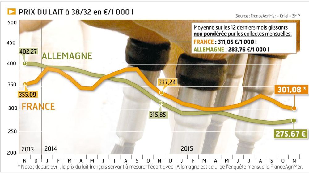 Les producteurs continuent de faire le dos rond sans le moindre espoir, pour l'instant, de jours meilleurs à court ou moyen terme. Les paies de lait reçues pour les livraisons de décembre se sont faites quasi à l'identique de celles de novembre. C'est toujours dans le Sud, spécialisé dans les PGC, que les prix sont les moins mauvais : 283,80 €/1 000 l (lait à 38/32). En décembre, les laiteries de l'Ouest ont grapillé 3 € pour tomber à 268,20 €. Dans le Nord, les prix ont été reconduits à 260,70 €. Toujours cuillère de bois, les entreprises de l'Est tournent à 254 € depuis des mois. Parmi elles, Rücker a payé 244,40 € comme elle le fait depuis août.
