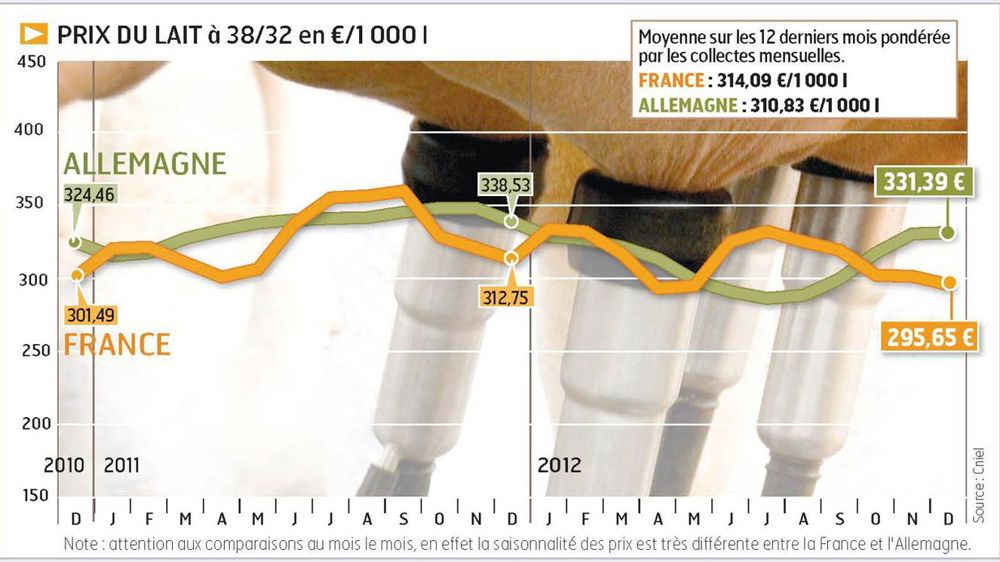 En janvier, si les laiteries du nord continuent de mieux payer (327,20 €/1 000 l à 38/32) que celles du sud (323,50 €/), l'écart diminue. De 25 € en novembre, il est passé à 16 € en décembre et à « seulement » 3,70 €/1 000 l aujourd'hui. Le tassement des prix dans le nord de - 9 €/1 000 l (sur 18 laiteries répertoriées) et la nouvelle progression dans le sud de 3 € (sur 17 laiteries) expliquent ce rapprochement. Les prix grappillent aussi 3 € en janvier à l'est (sur 5 laiteries connues) à 321,60 €/1 000 l. En revanche, ils s'effritent dans l'ouest de 5 € à 311 €/1 000 l. À l'échelle du pays, on recense 13 entreprises payant 332 €/1 000 l ou plus.