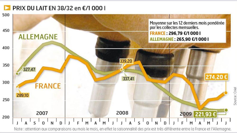 Les laiteries allemandes sont restées en août aux prix planchers atteints en mai. À l'ouest, Humana est toujours à 22 c/kg (lait à 37/34), la MUH, gros producteur de lait de consommation premier prix, à 20 c. Friesland Campina se distingue en remontant son prix de 3 c à 23 c/kg. Dans le nord, Normilch est scotché à 21 c et Rücker est passé de 19 à 20 c. Reconduction pour les producteurs bavarois de Muller, au sud, à 22,35 c et 1 c de hausse pour ses livreurs de l'est à 22 c. Dans le meilleur des cas, les producteurs en lait conventionnel (non bio) sont payés 23 c dans le nord, 25,55 c dans le sud, 23 c à l'ouest et 22 c à l'est.