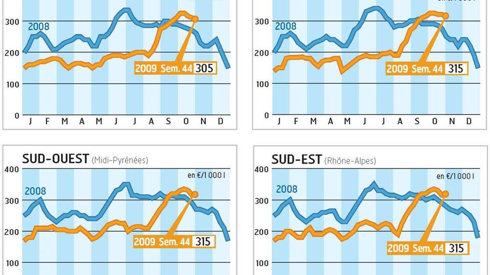 Le lait Spot ne profite pas vraiment de l'embellie récente des produits industriels. Après la poussée à 325 €/1 000 l dans l'ouest, semaine 40, il a reperdu 25 €/1 000 l. Explications. D'une part, les laiteries sont toujours prudentes dans leurs fabrications à destination du marché national et européen. Et il y a peu de lait entier à vendre, les industriels ayant intérêt au prix actuel de la matière grasse à l'écrémer. Ceci étant, les perspectives sont aujourd'hui plus favorables. L'UE est actuellement la seule en mesure de répondre à la demande du marché mondial en produits industriels.