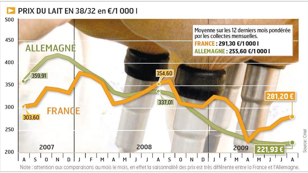 Au plancher depuis mai, le prix du lait allemand a connu un timide frémissement à la hausse en septembre. Il faut sans doute y voir, avec un prix du lait très réactif au marché, le signe du début de la remontée des cours des produits industriels. Nombre de laiteries ont répercuté une petite hausse de 1 jusqu'à 2 cents/1 000 kg. C'est le cas d'Humana à 23 c/kg (lait à 37/34), de Nordmilch (à 22 c/kg). Certaines ont été un peu plus généreuses comme Friesland Campina augmentant de 1,5 à 24,5 c/kg et Rücker à 21,5 c/kg. D'autres l'ont été un peu moins comme Muller dont le prix est resté scotché à 22 c/kg à l'est.