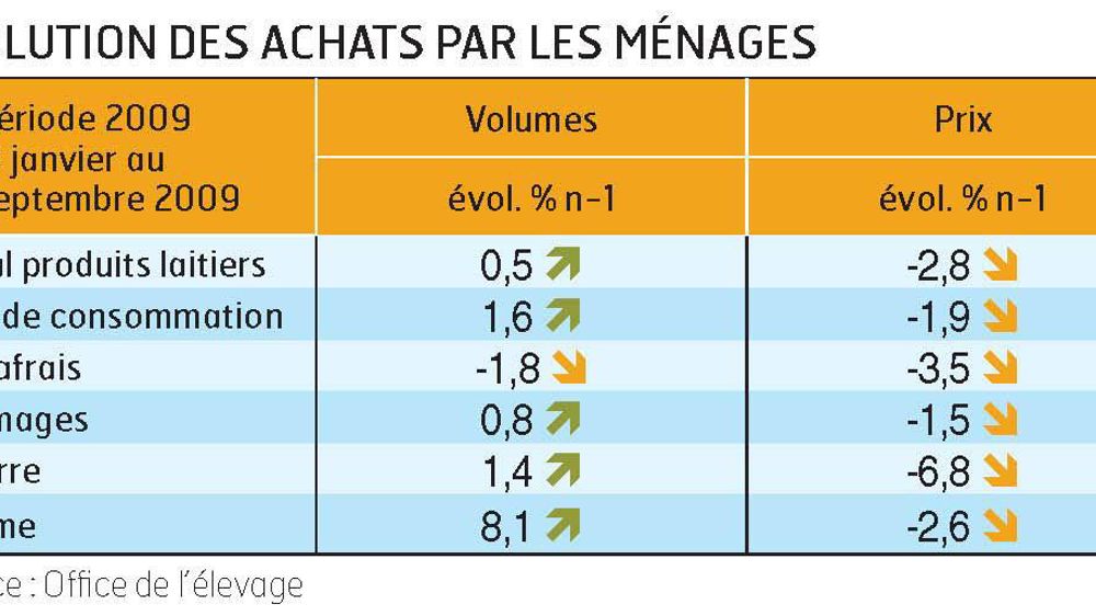 La consommation des PGC se tient en France. Pour autant, les fabrications sont à la baisse (sauf l'ultrafrais) : - 6,1 % pour le lait de consommation, - 13 % pour l'emmental entre janvier et août. C'est l'effet des importations qui concurrencent les produits français avec alors des prix sortie d'usine en baisse.