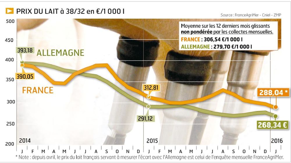 La grimace des producteurs allemands s'amplifie. La baisse du prix du lait, qui avait de nouveau donné des signes de faiblesse en janvier, se confirme. Après avoir perdu près de 10 €, ramenant le prix en deçà de ce qu'ils croyaient être le fond de la piscine - les 270 € atteints en juin -, le prix du lait accuse en février une nouvelle baisse sensible. Ce sont 7 à 8 € que les laiteries du Sud, de l'Ouest et du Nord ont payés en moins pour un prix moyen respectif de 270, 252 et 244 €/1 000 l (lait à 38/32). Les mégastructures de l'ex-RDA sont encore plus malmenées. Le prix y baisse de 11 €, à moins de 235 €/1 000 l.