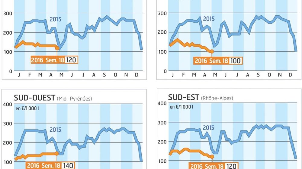 Une fois passé le pic de la collecte en France, et celui de la collecte européenne mi-mai, nous pourrons dire que le pire est derrière nous. Car cette crise ne s'estompera qu'avec un ralentissement de la production. Or, les chiffres de la collecte dans certains pays d'Europe du Nord donnent le vertige. Vu l'état des stocks dans les entreprises et le peu de demande sur le lait frais, les cotations du lait Spot restent très basses. Nous observons même un nouveau décrochage dans deux régions, lié au manque d'attractivité du marché italien à cette période. À l'inverse, le Sud-Ouest bénéficie de la demande espagnole toujours présente.