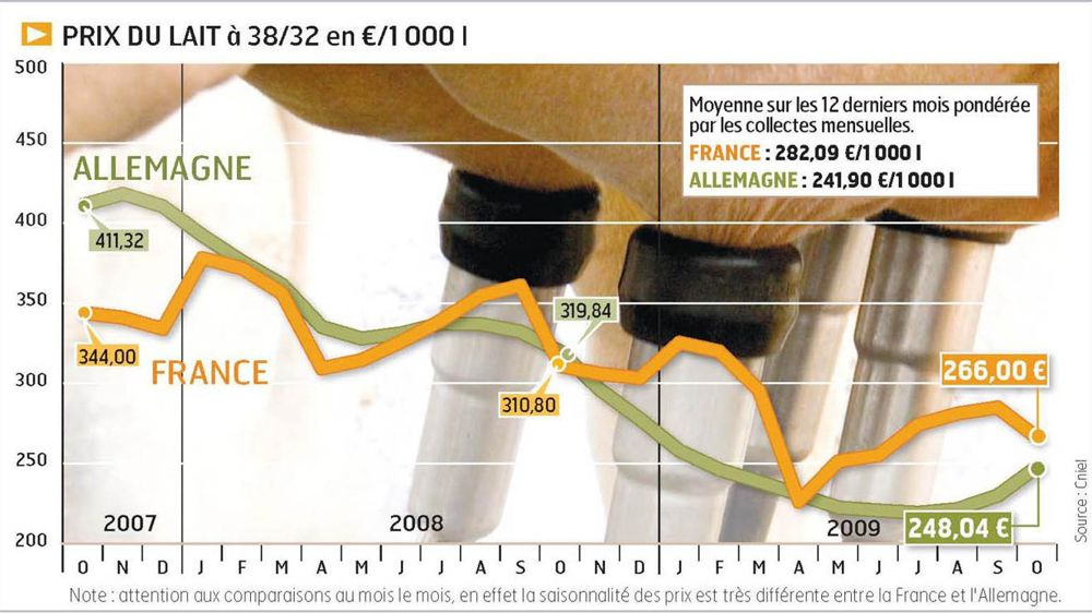 Après la hausse de 1 à 4 c/kg (lait à 37/34) d'octobre, ce sont encore autant que les producteurs allemands ont vu sur leur paye de novembre. Comme en octobre, la hausse apparaît plus marquée dans le nord. Logique, les produits industriels, qui retrouvent des couleurs, y pèsent plus lourd. La hausse y est au minimum de 2 c (comme pour Nordmilch à 260 €/t), avec beaucoup d'entreprises à + 3 c. Les laiteries du sud, beaucoup plus impliquées dans les PGC, n'ont répercuté que des hausses de 1 c. En moyenne, sur novembre, le prix de base du lait à 37/34 était payé 20 €/t de plus que dans le Sud.