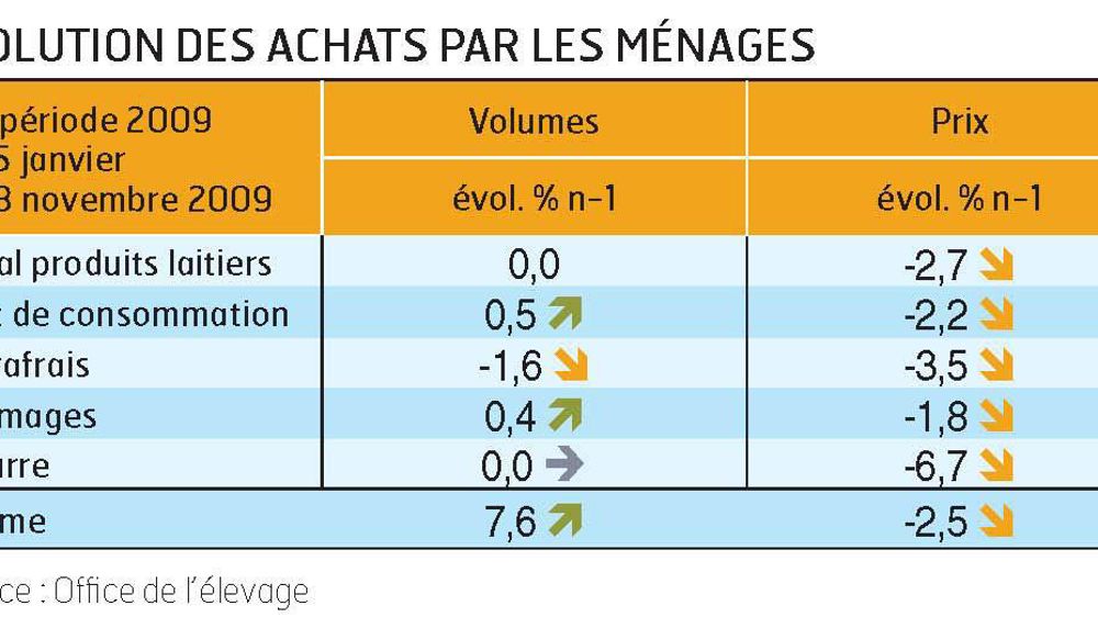 Les ventes au détail progressent en volume pour quelques produits (crème, beurre, fromage), mais les prix restent orientés à la baisse. Sur les neuf premiers mois de l'année, le solde commercial du lait de consommation s'est fortement amoindri. Les fabrications ont donc chuté (- 5,2 %).