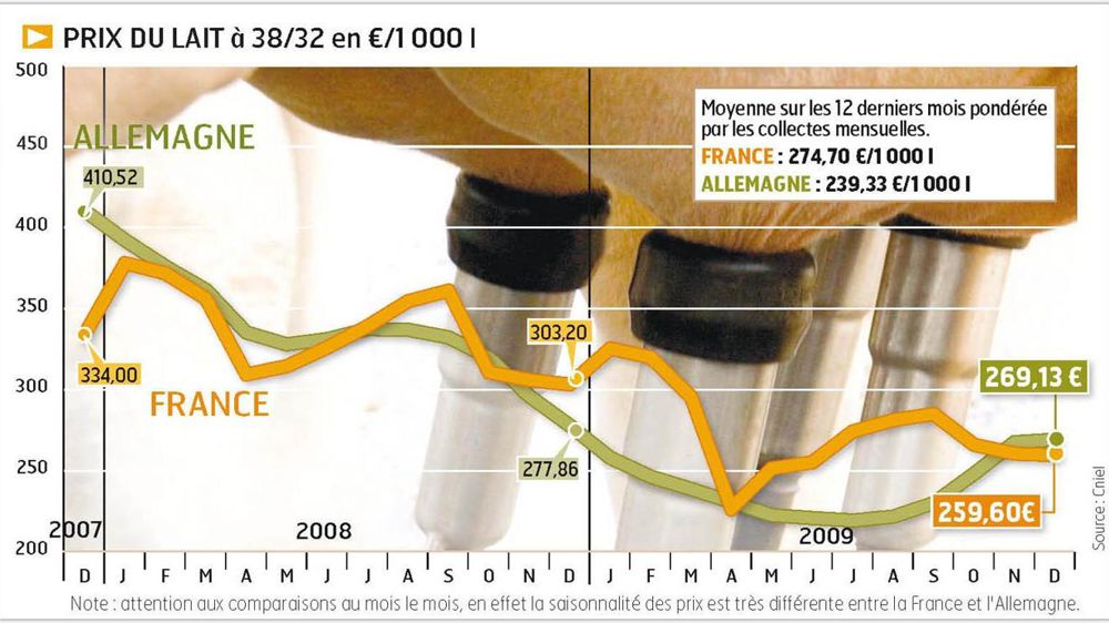 Reconduit en décembre dans la plupart des laiteries, le prix s'effrite à nouveau dans certaines d'entre elles. C'est surtout le cas au nord, gros fabricant de produits industriels. On y enregistre parfois des baisses de 1 à 3 c/kg (lait à 37/34). Nordmilch est toutefois une des laiteries à reconduire leur prix de décembre à 26 c/kg. Même tendance un peu moins accentuée à l'ouest avec un recul de 0,5 à 1 c. Exception à la règle : le prix chez Friesland Campina qui recule de 30,52, à 26 c/kg. Évolution contrastée au sud avec souvent des reconductions (comme à l'est), parfois de légères hausses (+ 1 c) ou baisses (- 1 c).