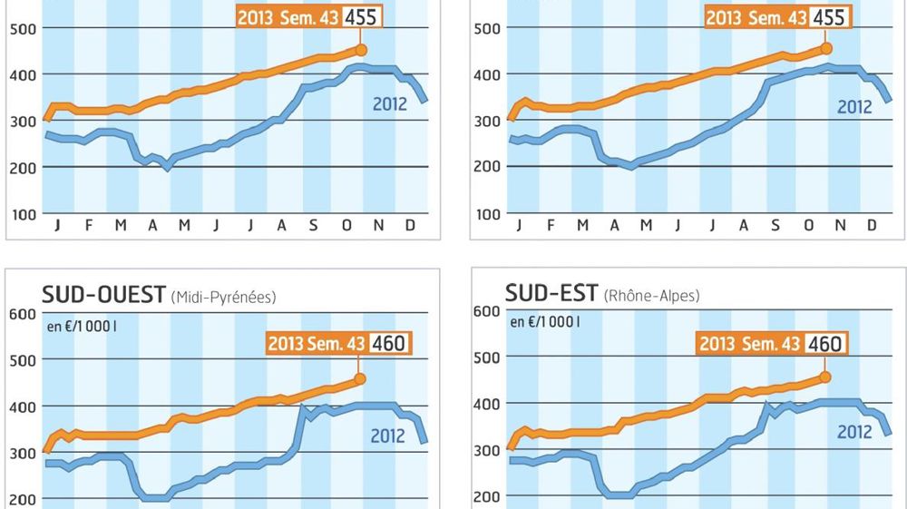 L'inquiétude des industriels de manquer encore de lait début octobre pour satisfaire leurs contrats avec les GMS s'est confirmée. Résultat : des prix sans doute arrivés au plafond. Les principaux acheteurs sont les fabricants de fromages et les conditionneurs de lait liquide. La demande des fabricants de produits frais et de glaces a, sans surprise, faibli avec l'arrivée de l'automne. Mais ils ont été remplacés par les acheteurs italiens et espagnols, de retour sur le marché français. Cela explique le coup de booster donné au lait Spot sur la moitié Sud. Certains camions s'y sont vendus jusqu'à 500 €/1 000 l.