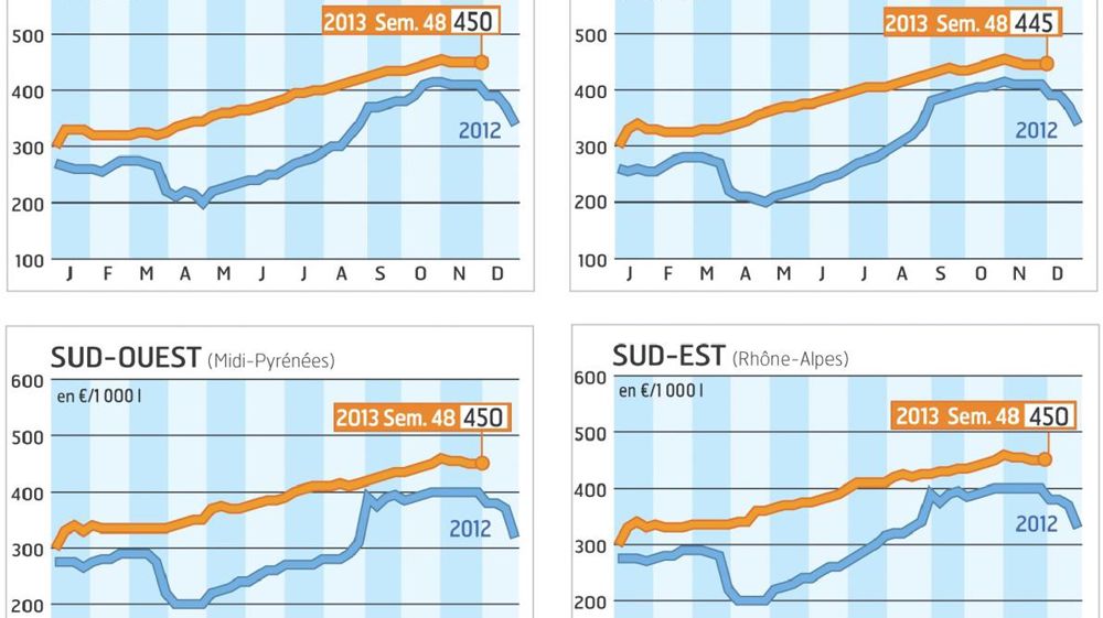 Le marché corrigé de 5 à 10 €/1 000 l reste très ferme. Cela tient à la faiblesse des disponibilités pour répondre notamment à la demande toujours importante de l'Espagne et l'Italie. Certes, la collecte nationale a repris du poil de la bête, mais insuffisamment par rapport à la demande. Peu d'offres aussi des laiteries qui, quand elle peuvent, transforment leurs excédents en produits industriels pour bénéficier de leurs cours toujours porteurs. La demande ne risque pas de fléchir dans les semaines à venir, l'Algérie ayant lancé un appel d'offres sur plus de 30 000 t de poudre grasse et écrémée, à livrer début 2014.