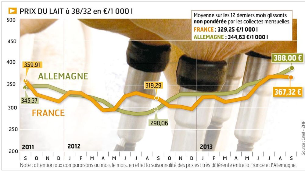 Les producteurs d'Allemagne du Nord prient pour que ça dure le plus longtemps possible. À la faveur d'une nouvelle hausse de près de 12 €/1 000 l, après celle de 15 € en septembre, le prix de base y tourne en moyenne sur octobre à 408 €/1 000 l (lait à 38/32). Sur les vingt-deux entreprises recensées, huit sont à 420 €, et seulement deux en deçà des 400 €. Progression aussi de 10 € dans l'Ouest, avec une moyenne de prix de base à 388,30 €/1 000 l. Spécialisée dans le lait UHT, la Muh vient en queue de peloton, à 371,50 €/1 000 l tout de même. Les prix ont aussi gagné 10 € dans le Sud plus orienté sur les PGC, à 381,70 €/1 000 l.