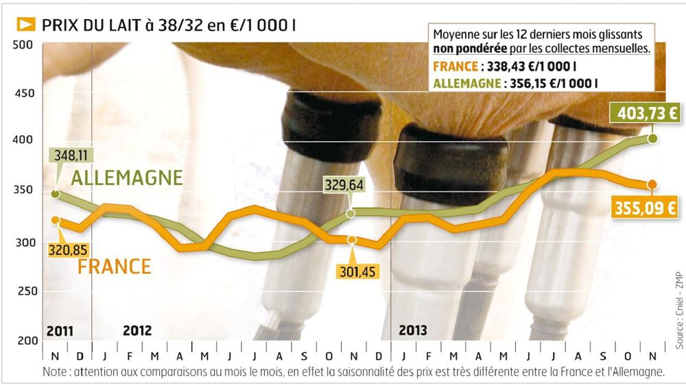 Les trésoreries des producteurs allemands continuent de se conforter. Les informations recueillies sur les premières payes de décembre montrent un prix du lait toujours aussi bien orienté. Sur 21 laiteries connues dans le Nord, le prix s'effrite de façon quasi imperceptible (- 3,50 €/1 000 l) pour passer de 412 à 408,50 € de moyenne (lait ramené à 38/32). Dans cette région, huit entreprises sont à 420 €/1 000 l. L'effritement est tout aussi léger à l'Ouest. La moyenne y tourne désormais autour de 390,50 €/1 000 l. La fermeté du prix de rigueur dans les laiteries du Sud et de l'Est l'amène à 393,50 € de moyenne.