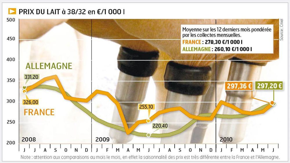 La hausse du prix se poursuit outre-Rhin avec, en juin puis juillet, un bonus de 10 €/1 000 kg. Les laiteries du nord (grosses productrices de beurre-poudre) sont celles qui affichent la plus forte progression avec, en moyenne, + 2,3 c/kg sur juillet par rapport à mai. Les prix y sont aussi en moyenne les plus élevés à 30,4 c/kg (lait à 37/34). Ils y étaient les plus bas il y a un an. Exemple avec Nordmilch, à 21 c en juillet 2009, qui paye désormais sur la base de 30 c. Dans l'ex-RDA, la hausse est du même acabit (+ 2,2 c) à 29,97 c. Elle est un peu moindre au sud (+ 2,1 c) à 30,3 c, et surtout à l'ouest (+ 2,04 c) à 29 c/kg.