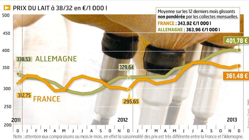 Les premières estimations officielles pour le mois de décembre sont tombées outre-Rhin et, avec elles, celles du prix moyen annuel du lait. Avec une moyenne de 364 €/1 000 l payés en 2013 (lait à 38/32), ce sont près de 8 000 € de chiffre d'affaires en plus qu'une exploitation allemande a engrangé, comparée à son homologue française (344 €/1 000 l lait à 38/32, toutes primes et qualités confondues). Les informations concernant les dernières payes reçues montrent dans le Nord, là où le lait était le mieux payé un recul de 10 à 30 €/1 000 l sur janvier, mais les prix y restent de 390 à 400 €/1 000 l.