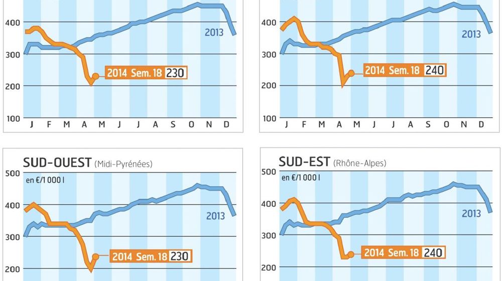 Le décrochage du prix du lait Spot à 230 €/1 000 l et moins n'étonne pas les spécialistes du secteur. Il fallait s'y attendre au regard de la dynamique de la collecte, vu la capacité de transformation qui est à saturation, non seulement en France, mais aussi chez nos voisins. S'y ajoute pour les fabricants de pâtes molles, la conséquence d'une consommation de leurs produits en berne depuis début mars avec le retour de la chaleur, qui ne les incite pas à fabriquer trop de stocks. L'Espagne, qui achetait encore à la veille de Pâques, a aussi cessé ses commandes. Et ce, d'autant que la collecte a repris chez elle.