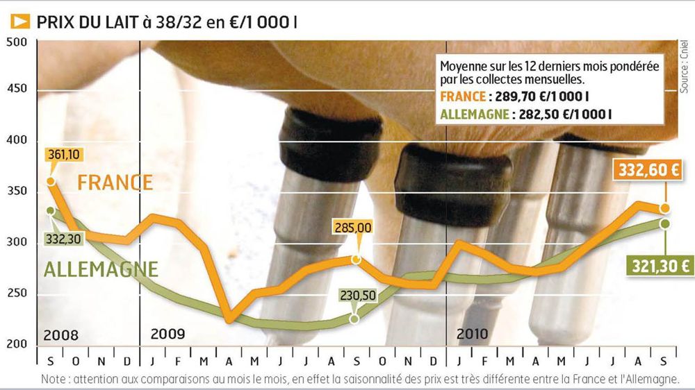 La hausse du prix du lait se poursuit en octobre et, comme en septembre, de façon plus marquée dans le Nord, gros fabricant de produits industriels, que dans le Sud, plus orienté sur les PGC. À l'image de la coopérative Nordmilch dont le prix passe de 32 à 33 c/kg (lait à 37/34), nombre d'entreprises du Nord affichent une hausse de 1 c/kg (+ 0,7 c/kg de moyenne à 33,29 c sur vingt entreprises). Dans le Sud, la hausse est deux fois moins marquée (0,39 c) avec un prix moyen dans vingt-quatre laiteries de 32,14 c/kg. Hausse intermédiaire pour les laiteries de l'Est (0,5 c/kg) avec, pour Muller, un prix de 31,5 c/kg.