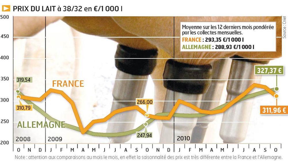 La hausse du prix du lait marque le pas outre-Rhin. En Novembre, très nombreuses sont les laiteries qui ont reconduit leur prix d'octobre. Quelques-unes, beaucoup plus rares, l'ont encore augmenté de 1 c/kg. Pas de changement donc dans les différences entre les régions. Le lait continue d'être mieux payé dans le nord, gros fournisseurs de produits industriels. Le prix y oscille entre 33 c (lait à 37/34), à l'instar de Nordmilch, et 35 c/kg. Dans le sud, producteur de PGC, le lait se négocie entre 30,65 et 33,65 c. À l'ouest, les adhérents de Friesland Campina ont aussi retrouvé le sourire avec leur 1 c/kg en plus à 35 c/kg.