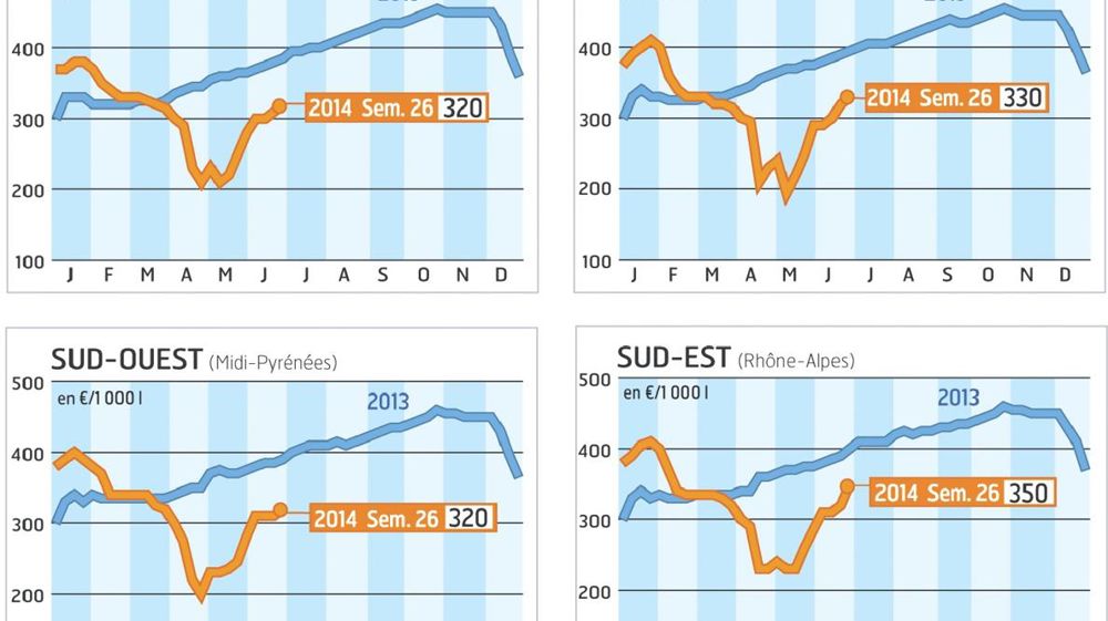 Le marché a retrouvé une fluidité certaine, le pic de collecte passé. Les excédents à valoriser sur le marché Spot sont bien moindres et, si besoin, les tours de séchage ne sont plus saturées. Comme d'accoutumée à cette période où la collecte allemande baisse, des opportunités s'offrent à nouveau sur l'Italie. Les cours y ont gagné 65 €/1 000 l de la semaine 22 à 26 quand, dans le même temps, ils ne progressaient « que » de 40 €/1 000 l dans la moitié nord. La hausse a aussi été modérée pour le lait destiné à l'Espagne, les opérateurs continuant pour l'instant de trouver du lait moins cher à domicile.
