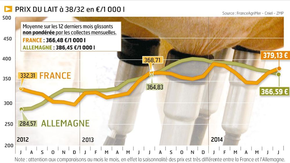 Le prix du lait continue de s'éroder tout en restant, sur les 12 derniers mois glissants, à 20 € de plus qu'en France. De quoi appréhender outre-Rhin, avec une relative sérénité, les baisses plus conséquentes attendues pour la fin de l'année du fait de l'embargo russe. Si en août, la tendance est à un nouveau recul de 4 €/1 000 l dans le Sud et de 7 € ailleurs, on s'attend pour les mois suivants à une baisse mensuelle de 15 €/1 000 l. Cela porterait le litre de lait à 38/32 en moyenne à 300 € en décembre au niveau national. Et sûrement moins dans le Nord et l'Est, plus exposés de par leurs fabrications de produits industriels.