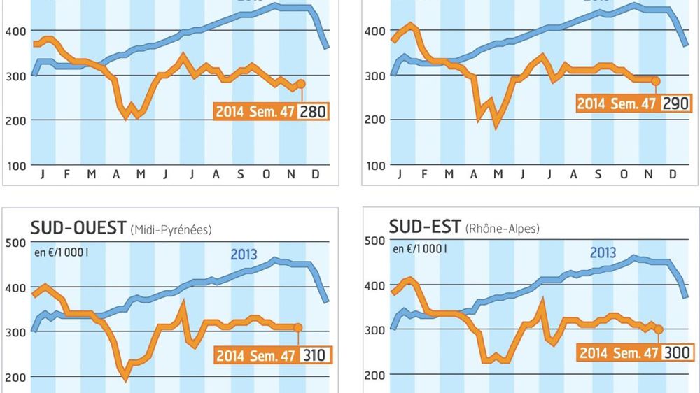 A la surprise générale, la collecte n'est pas vraiment encore à la hauteur où l'attendaient les prévisions. Résultat : des cours du Spot stables des semaines 43 à 47 dans un marché au coup par coup. On achète ici et là une à deux citernes pour équilibrer le bilan matière de la semaine ou pour contenir le prix d'achat moyen entrée usine en bénéficiant d'un lait Spot moins cher que celui acheté à ses propres producteurs. Si les échanges restent actifs avec l'Espagne, les choses sont plus compliquées sur l'Italie où beaucoup de lait est disponible et où l'Allemagne reste à l'affût de chaque opportunité.