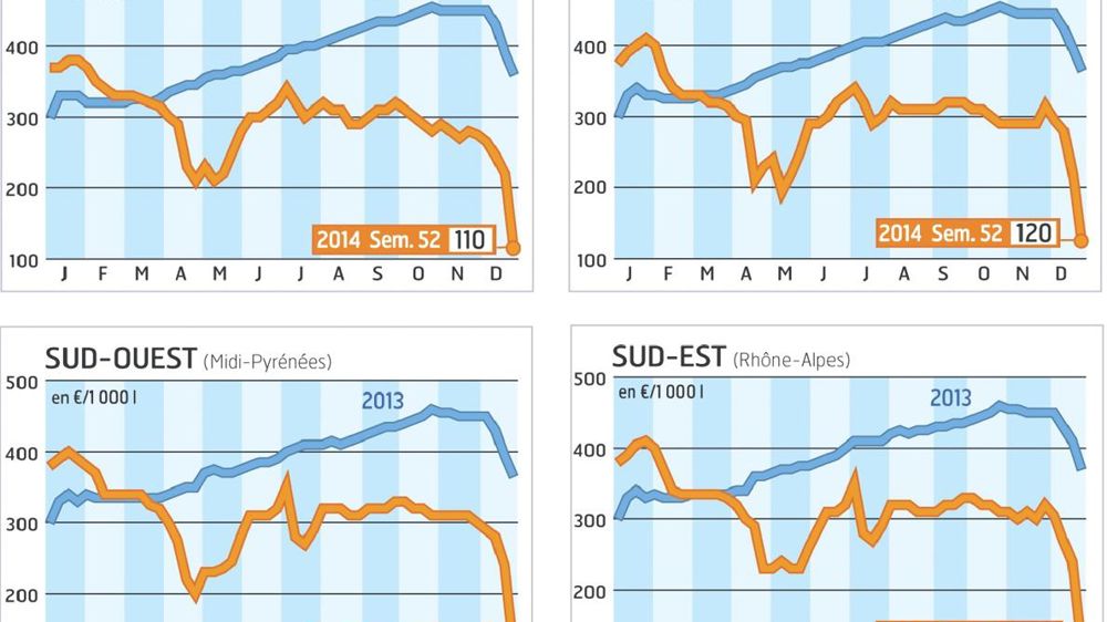 Une insulte au métier ces quelques citernes de lait négociées à 20 €/1 000 l départ quai d'usine (il ne manque pas un 0 !) pour livraison la semaine de Noël. Elles traduisent une situation jamais vue, des courtiers qui peinaient fin décembre à trouver acheteur à plus de 110 €/1 000 l départ d'usine. Au cours des cinq dernières années, le lait spot, qui plonge toujours semaine 52, n'était jamais tombé plus bas que 270 €/1 000 l. Cette situation que personne n'avait vu venir semble surtout traduire un manque de confiance des transformateurs à alourdir leurs stocks, ne sachant pas à quel prix ils vendront demain. En effet, il n'y a pas plus de lait que l'an dernier et les capacités de séchage sont plutôt un peu supérieures.