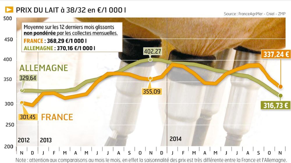 La baisse continue dans le nord du pays où se fabriquent surtout des produits industriels. En décembre, les payes ont encore été amputées de 18 €/1 000 l avec une moyenne sur 22 laiteries répertoriées à 278 €/1 000 l (lait à 38/32). La cuillère de bois à l'usine DOC Kaas de Dörpen avec un prix du lait à 235 €... Il y a un an, il y pointait à 415,50 €. Ce sont désormais plus de 40 € qui séparent les producteurs du Nord de ceux du Sud, plus épargnés avec des laiteries plus orientées sur les PGC. En décembre, le prix s'y effrite de seulement 9 €/1 000 l à 320,80 € sur une trentaine de laiteries. Cinq y payent encore à plus de 332 E/1 000 l.
