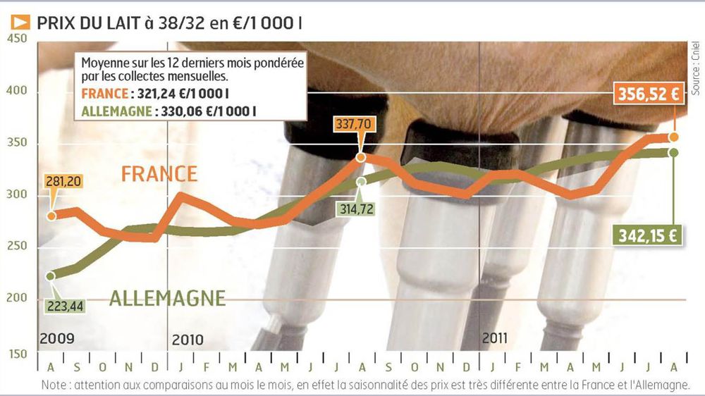 Les laiteries d'Allemagne du Nord continuent en septembre de caracoler en tête des prix du lait. Il s'établit à 35,46 c/kg (lait à 40/34) sur vingt laiteries connues, en progression de 0,38 c par rapport à août. Neuf pointent à 36 c, une à 37 c et dix à 38 c.
