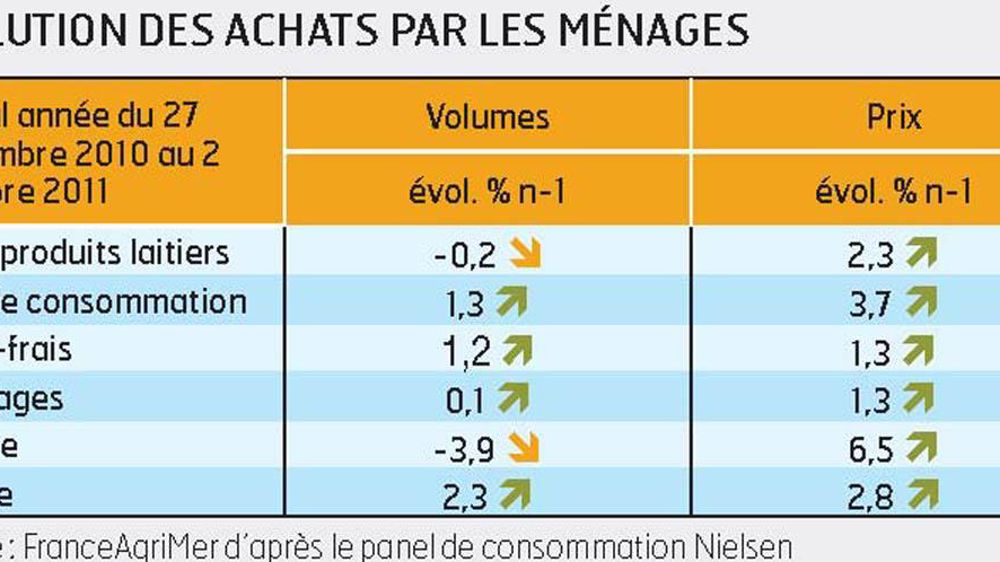 Le marché des produits de grande consommation donne quelques inquiétudes. C'est d'abord le climat froid de cet été qui n'a pas été favorable à la consommation de produits ultrafrais et de crème. Sur les neuf premiers mois de l'année 2011, les achats des ménages baissent de 0,2 % tous produits confondus. La crainte des transformateurs est que la crise financière ne se transforme en une crise économique grave qui amputera la consommation en fromages et ultrafrais jusque-là dynamique. Quand au beurre et au lait de consommation, les achats des ménages sont orientés à la baisse depuis plusieurs mois. Pour le lait liquide, la pression des importateurs allemands s'est un peu atténuée (la Muh a perdu des contrats) mais nos exportations sont toujours en baisse (- 40 % sur les sept premiers mois de 2011). De septembre 2010 à septembre 2011, les prix de vente au consommateur ont progressé de 4 % en moyenne. Les prix de vente industriels ont eux aussi été relevés : entre 4 et 10 % selon les produits. Les transformateurs ont donc pu répercuter, au moins en partie, la hausse du prix du lait.