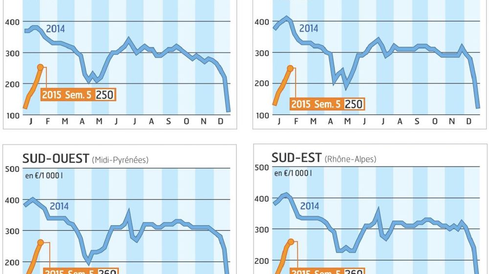 Après la descente aux enfers à 110-120 €/1 000 l la semaine de Noël, du jamais-vu, les cours du lait Spot commencent à se corriger. Mais la reprise du marché reste très timide, malgré le peu d'afflux de lait proposé, témoignant d'une demande très calme. Les fabricants de fromages, produits frais, lait UHT, voire de poudres de lait, qui avaient délaissé le marché mi-décembre ne reviennent que lentement aux achats. Pour que les prix se redressent plus nettement, il faudra que le ralentissement de la collecte se confirme, mais surtout que la demande soit un peu plus active.