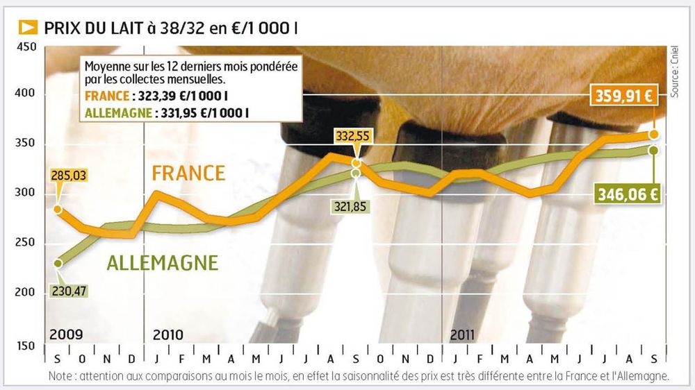 La bonne tenue des marchés des produits industriels continue de jouer à plein pour les laiteries du Nord très impliquées dans ces fabrications. En octobre, le prix du lait continue de s'y conforter en progression de 0,7 c/kg à 36,26 c/kg de moyenne sur 21 laiteries (lait à 40/34). La coopérative Nordmilch y pointe à 35 c, comme Humana, située dans l'Ouest, à laquelle elle est associée au sein de DMK (6,7 Mt de lait). Le coup de pouce sur le prix d'octobre apparaît du même acabit à l'est (+0,6 à 34,64 c/kg) mais beaucoup moins sensible au sud à 34,85 c et l'ouest (34,08 c/kg) où il stagne.