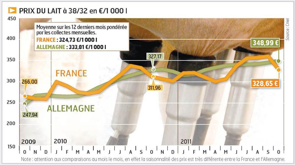 Les premiers retours sur les payes de lait de novembre montrent une reconduction des prix pratiqués en octobre dans toutes les régions. Les laiteries du Nord continuent d'afficher le prix moyen le plus haut à 359,45 €/1 000 l avec, sur quinze laiteries référencées, sept qui payent sur la base de 371,48 €/1 000 l (lait à 38/32). La coopérative Nordmilch y pointe à 342,15 €, niveau le plus bas, mais aussi moyenne des laiteries du Sud. Les prix y varient entre 332,37 et 351,92 €. Dans l'Ouest où la moyenne tourne autour de 333,84 €, la redoutable Muh, exportatrice de lait de consommation, reste au plancher à 322,60 €.