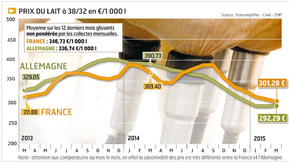 Les laiteries du Sud et de l'Ouest, les deux régions où le prix du lait est maintenant le plus élevé du pays, ont repris sur les paies du lait d'avril une partie de la légère hausse qu'elles avaient consentie en mars (respectivement 10 et 6 €/1 000 l). Dans le Sud, le prix s'effrite de 3 €, à 298,45 €/1 000 l (lait à 38/32). Dans l'Ouest, il recule de 5,20 €, à 285,20 €/1 000 l. Dans le Nord, où le rebond de mars avait été moins sensible, le lait regagne 2,50 €, à 279 €/1 000 l. Dans l'Est, la hausse est plus marquée (6 €/1 000 l). Pour autant, les laiteries y tiennent toujours la cuillère de bois, avec un prix moyen en avril de 273 €/1 000 l.