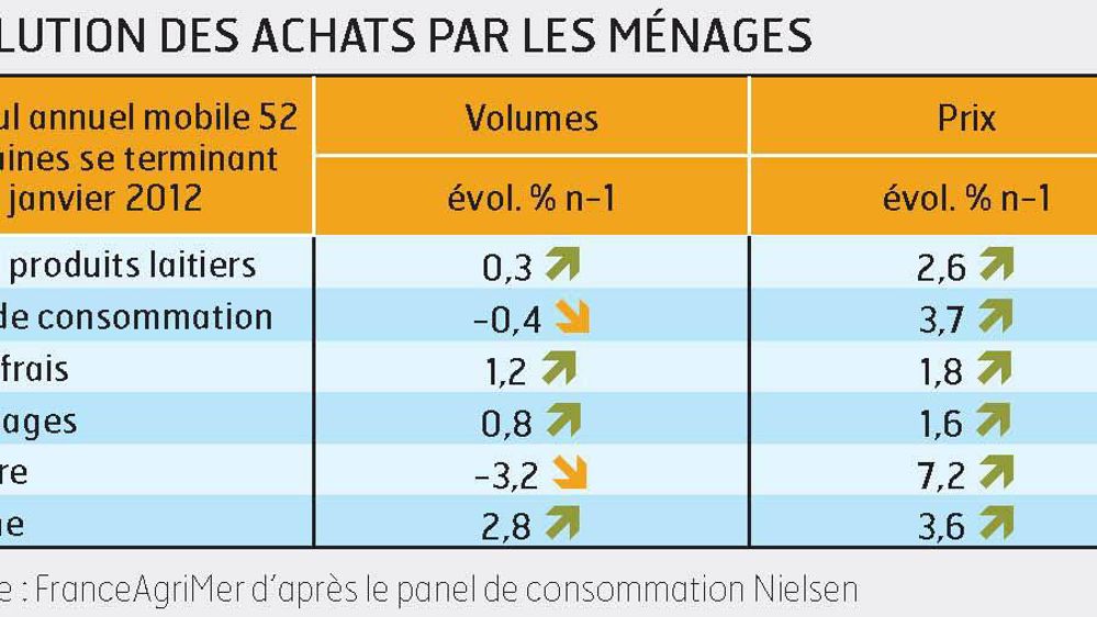 Les prix de vente industriels des différents PGC évoluent peu depuis l'été 2011. Les Allemands, toujours plus réactifs, ont connu des baisses de tarifs. Sur les trois premiers mois de 2012, les achats des ménages en crèmes et en fromages sont en progression. L'ultra frais et le lait liquide sont plus à la peine.