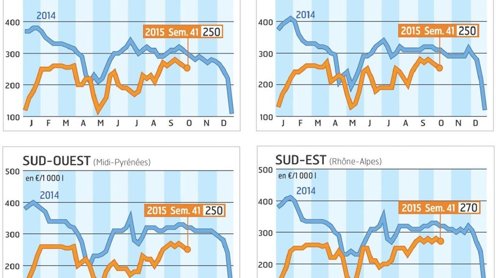 Si les cotations sont logiquement montées en septembre, période du creux de la collecte, elles ont été loin de s'envoler du fait de la demande. Elles restent atones, avec des industriels qui réduisent leurs achats le plus possible, ne voulant pas augmenter leurs stocks de produits. De plus en plus de transformateurs achètent aussi à la dernière minute en fonction de la demande des GMS. Dans la moitié sud du pays, les échanges ont été perturbés par des Espagnols très en retrait sur le marché. L'Italie a aussi peu acheté en France. Elle s'est fournie en Allemagne, en Tchéquie ou en Hongrie.