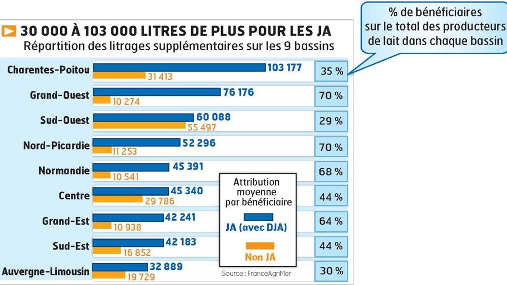 Le bilan de la première année de gestion des références laitières par bassins laitiers est tombé. Ce dispositif, poussé par Bruno Le Maire, a vu sur la campagne qui s'achève, 923 Ml redistribués. 761 Ml l'ont été à titre gratuit, dont 733 Ml sur la ressource 2011-2012 (inclus le retour de 1 % de l'UE) et 28 Ml de report de quantités gelées en 2010-2011 dans le Sud-Est et en Auvergne-Limousin. S'y ajoutent 162 Ml redistribués via le dispositif payant des TSST (transfert spécifique sans terre), dont 132 Ml intrabassin et 30 Ml issus d'une mutualisation nationale. Ces redistributions se sont opérées sur des critères choisis par chaque bassin dans ceux définis par l'arrêté ministériel : JA depuis moins de cinq ans, investisseurs récents (dans quatre bassins), producteurs à conforter (choix d'un forfait ou du taux de quota), prise en compte du taux de réalisation comme critères d'exclusion (85 % en Nord-Picardie, 96 % dans le Sud-Est), prise en compte de la main-d'oeuvre (dans trois bassins), retour aux cessionnaires (dans huit bassins). Des zones spécifiques ont aussi été retenues dans le grand Est (minoration des attributions en zone AOP, majoration en zone en déprise), le Sud-Est (dispositions particulières dans les Savoie et les zones à très faible densité) et Nord-Picardie (bonification de 25 % dans le massif des Ardennes). Au final, ces redistributions ont bénéficié à 58 % des producteurs avec une moyenne de 15 200 l, mais de fortes disparités selon les bassins, et entre les JA et les autres.