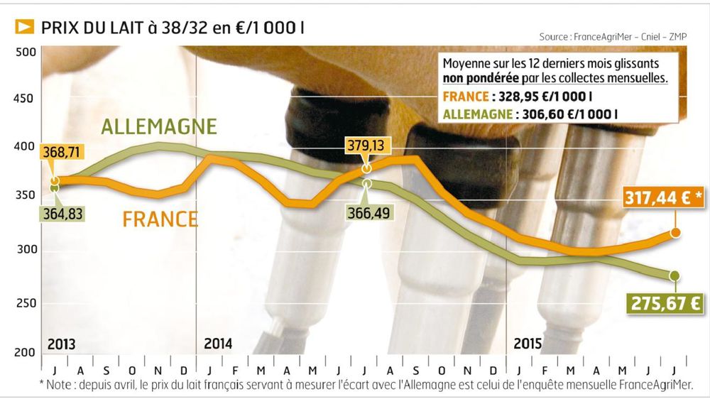 Le prix du lait allemand continue sa descente aux enfers avec, en août, encore 2 à 5 € de perdus selon les régions. La rumeur commence à courir qu'en décembre, toute l'Allemagne serait à 250 €/1 000 l (lait à 38/32). Les laiteries de l'est du pays y sont déjà avec une moyenne en août de 251 €/1 000 l. On y recense quatre entreprises à moins de 250 €/1 000 l dont la voiture-balai du pays à 235 €. Les producteurs du Nord sont passés sous les 260 € (257 €/1 000 l), quand ceux de l'Ouest sont encore au-dessus, mais tout juste (264 €). Dans ce contexte, le Sud apparaît comme nanti avec un prix, en moyenne, de 278 E/1 000 l.