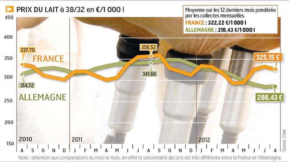 L'espoir des Allemands d'avoir touché le fond en juillet s'est concrétisé. Le prix du lait a rebondi en août dans toutes les régions. Les laiteries du Nord enregistrent la plus forte hausse, près de 20 €/1 000 l, à 299,43 €/1 000 l (lait à 38/32) de moyenne. Le Nord, plus engagé sur les produits industriels, repasse ainsi devant le Sud, plus orienté sur les PGC. Le prix n'y progresse que de 6,80 €/1 000 l à 294,79 €. La remontée est aussi très nette dans l'ex-RDA : 16,60 €/1 000 l, à 286,43 €/1 000 l. Dans l'Ouest, l'augmentation est de près de 8 €, à 279,29 €/1 000 l. La Muh, exportatrice de lait UHT, y est toujours bonne dernière à 259 €/1 000 l.